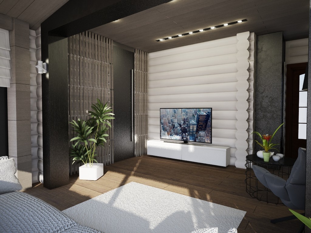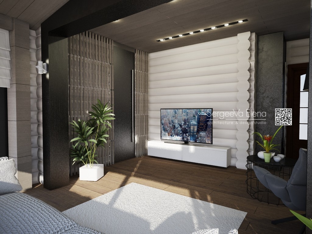 Проект по комнате отдыха общей площади 22 кв.м. Деревянные конструкции и декоративные элементы от компании "Лествиль" откатная дверь в душевую комнату, шкаф и обрамление проема от компании Giulia Novars. Проект выполнен и построен в 2016г в г.Самара