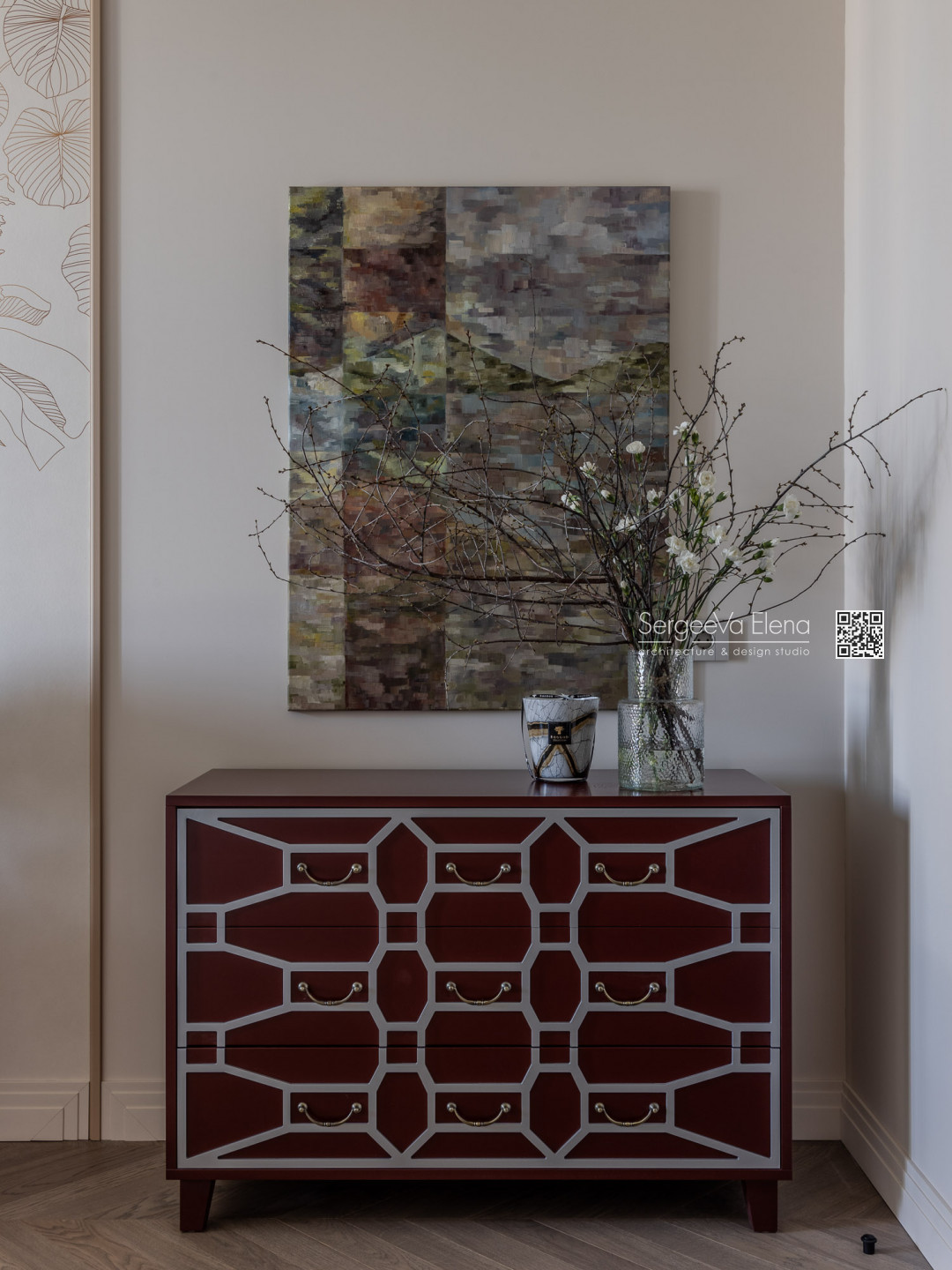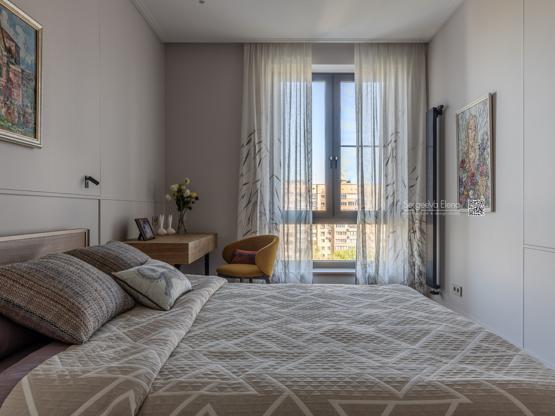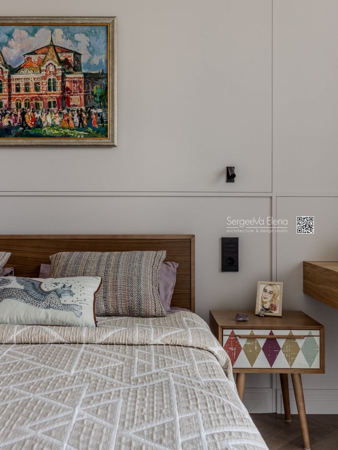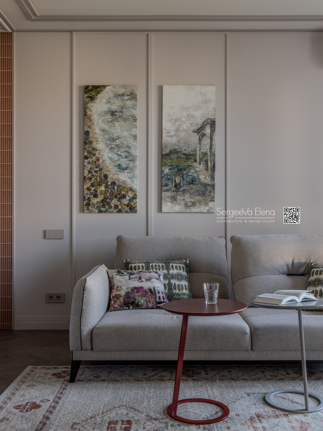 Реализованный проект квартиры общей площади 100м2. Автор картин в кухонно - гостиной комнате и в хозяйской спальне Елена Сергеева
