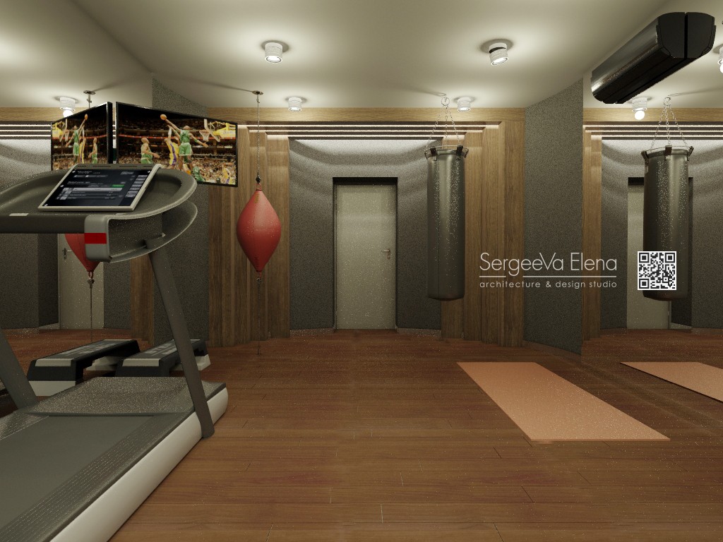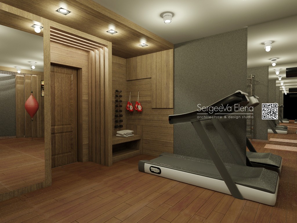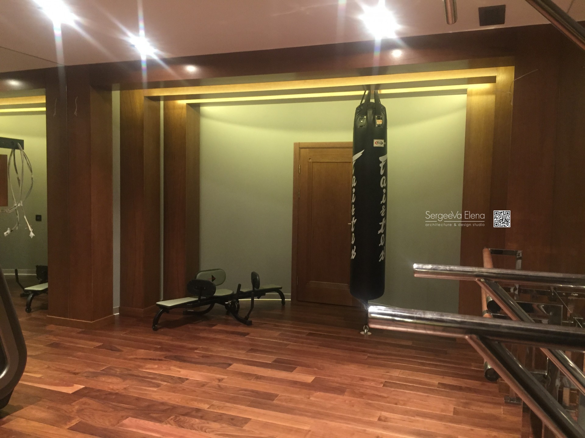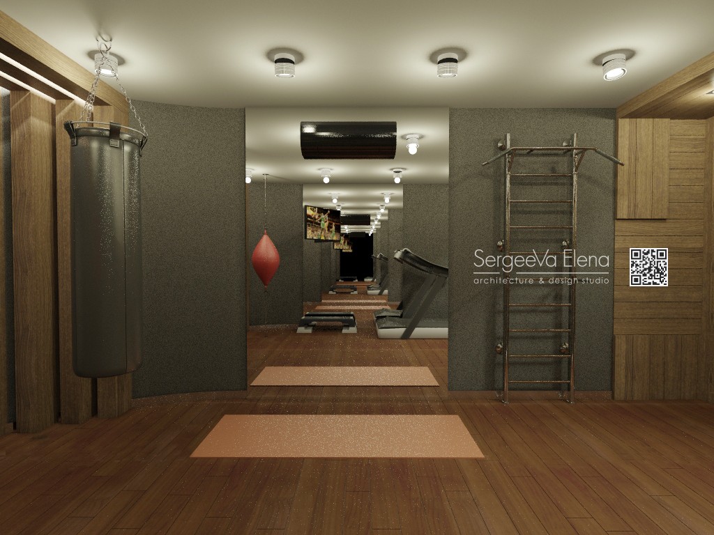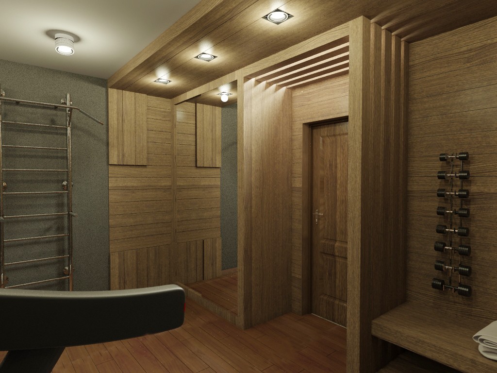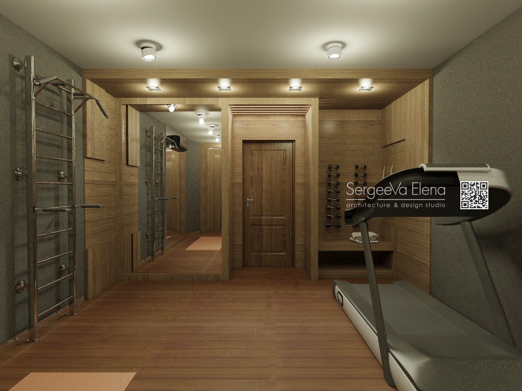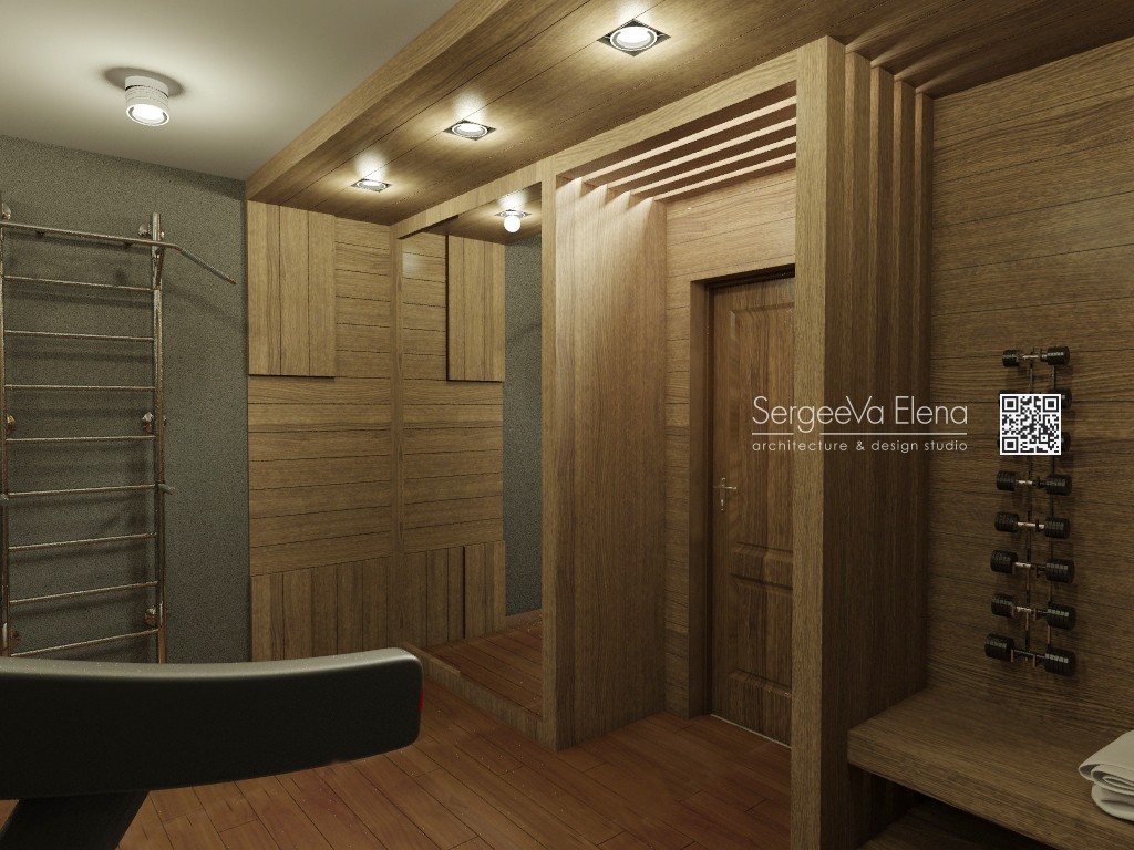 Проект спортзала общей площади 26 кв.м. Все деревянные конструкции от компании "Лествиль", тренажер и гантели компании "Technogym", светильники компании "Centrsvet". Проект выполнен и построен в 2016г . в городе Самара
