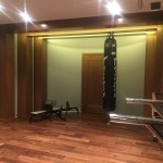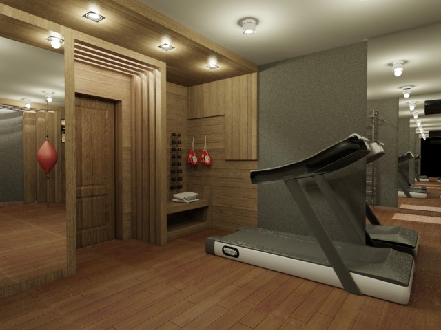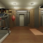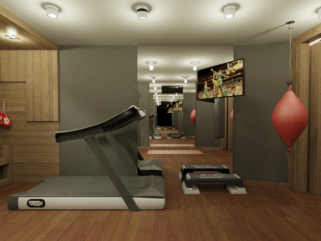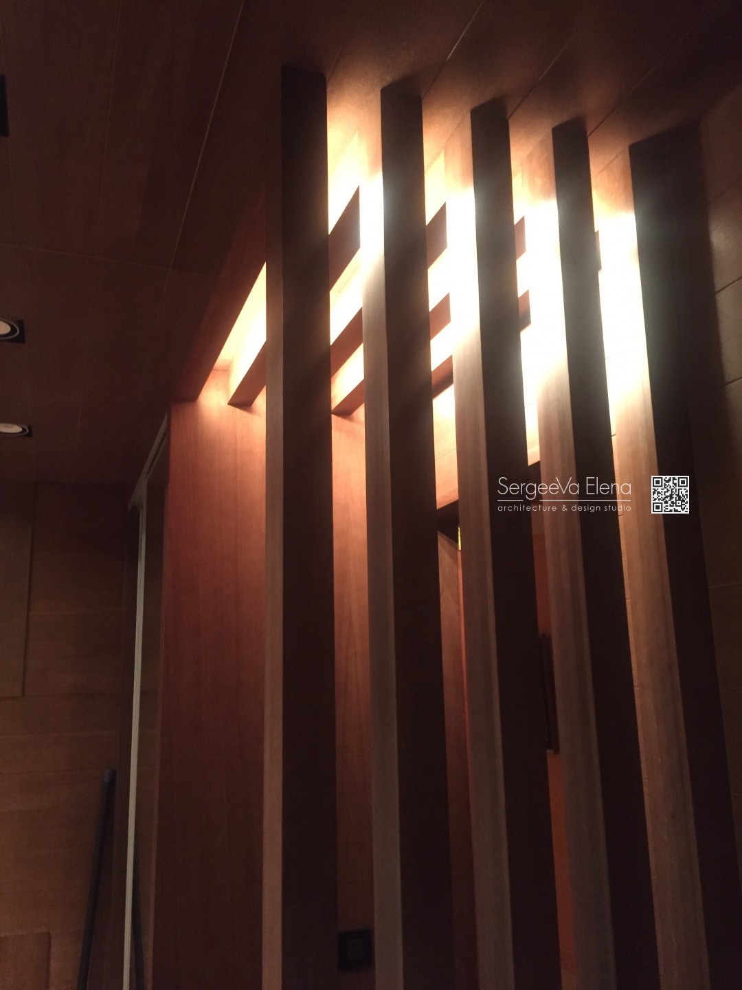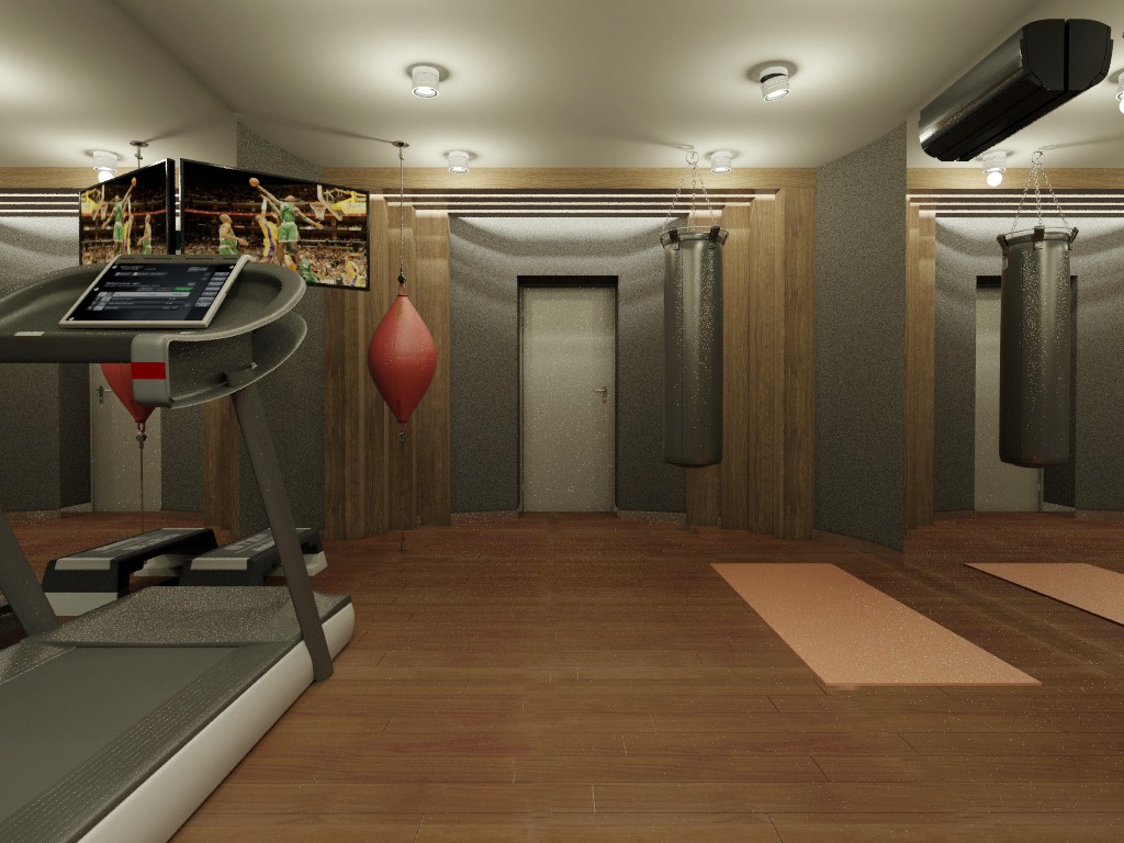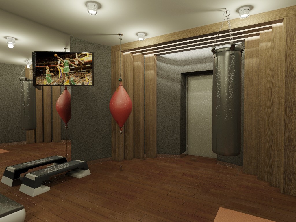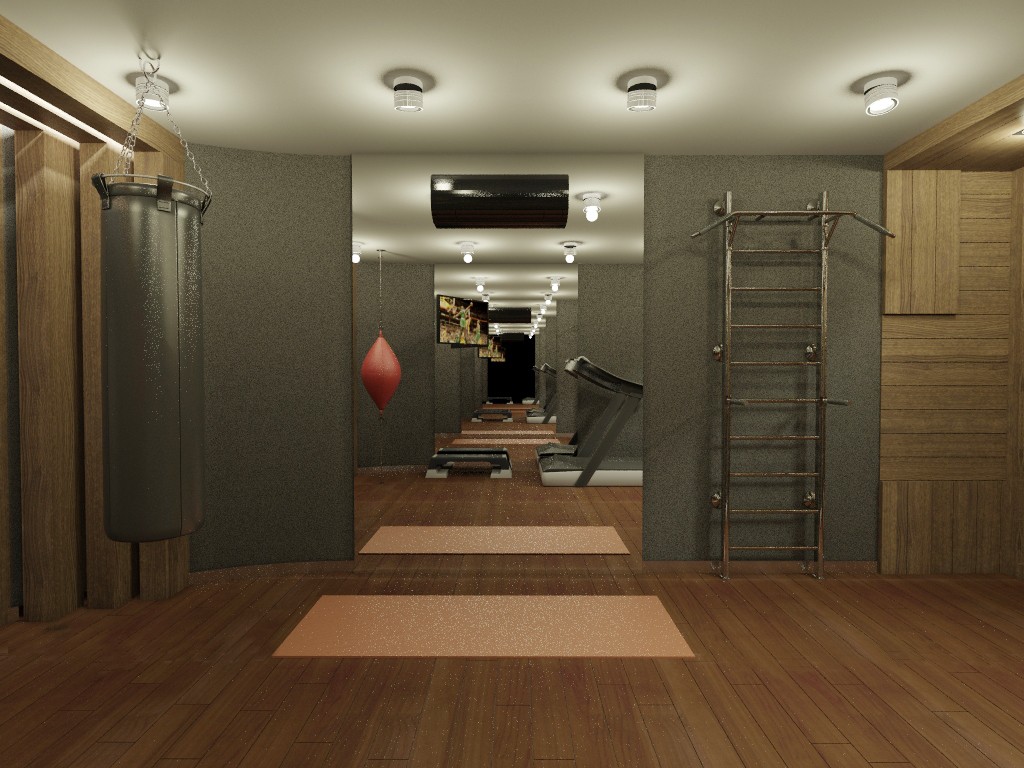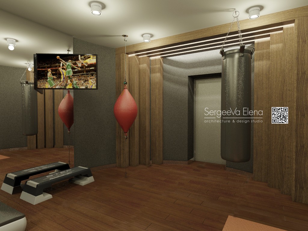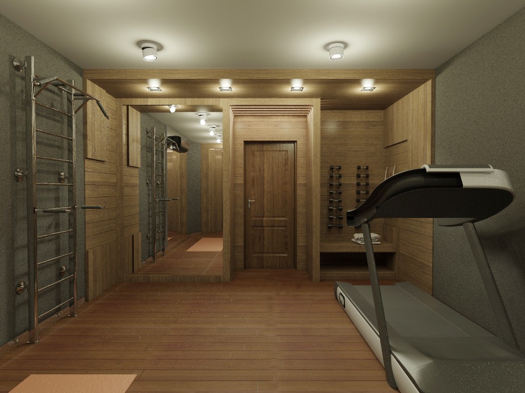 Проект спортзала общей площади 26 кв.м. Все деревянные конструкции от компании "Лествиль", тренажер и гантели компании "Technogym", светильники компании "Centrsvet". Проект выполнен и построен в 2016г . в городе Самара